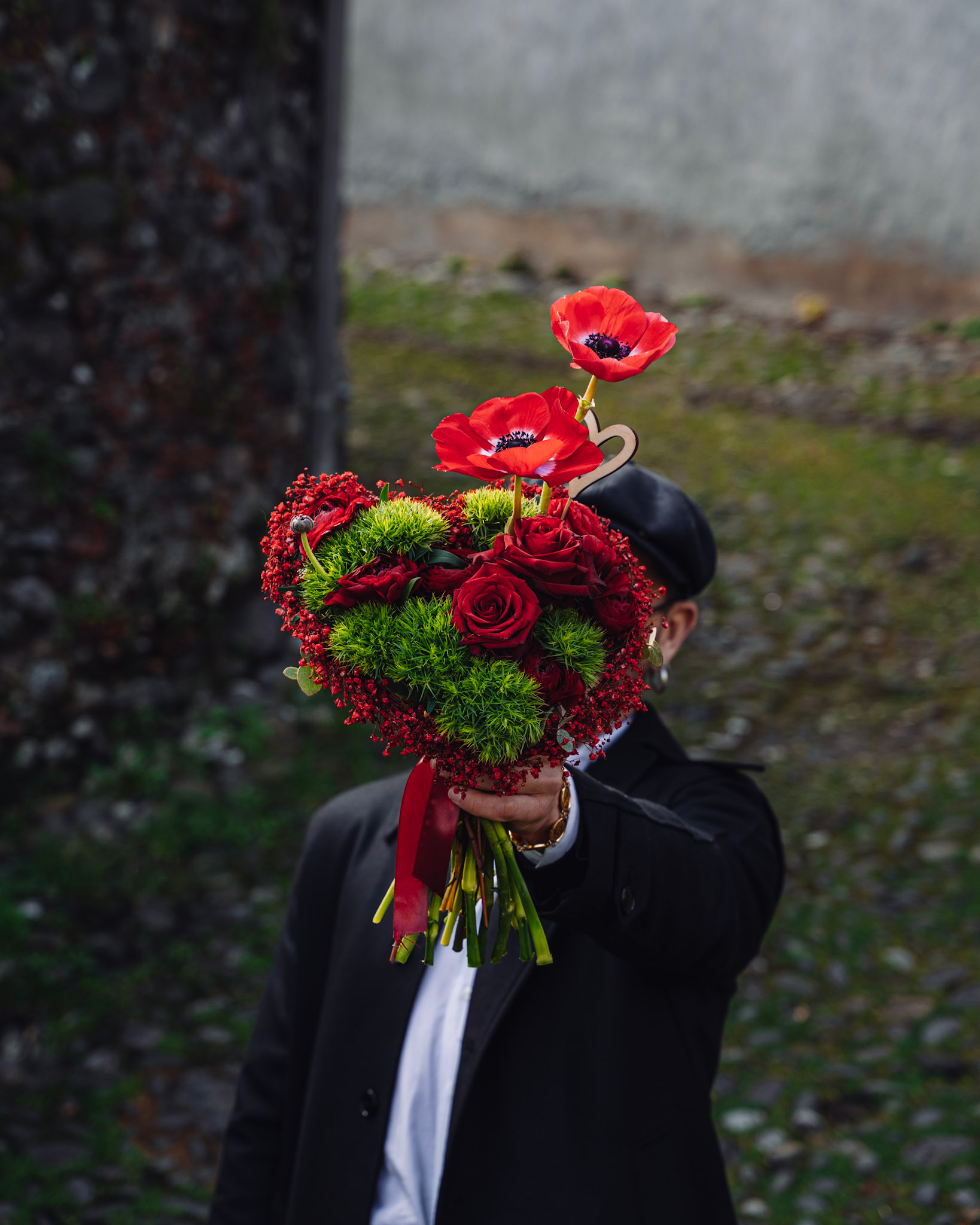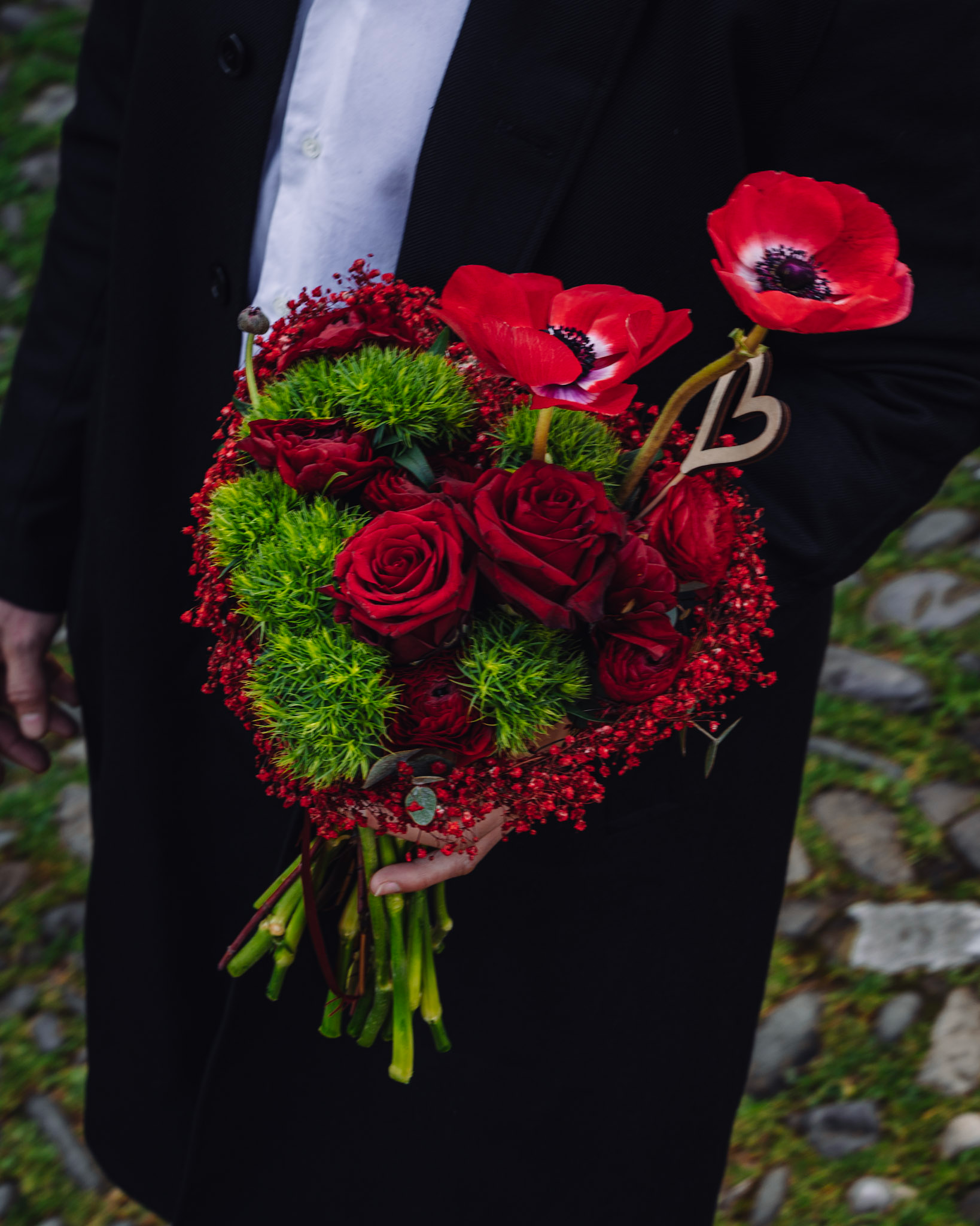 All’interno si intrecciano anemoni, ranuncoli, dianthus e rose rosse, selezionati per creare profondità, movimento e diverse texture, tutte unite da un’unica tonalità intensa e passionale.
