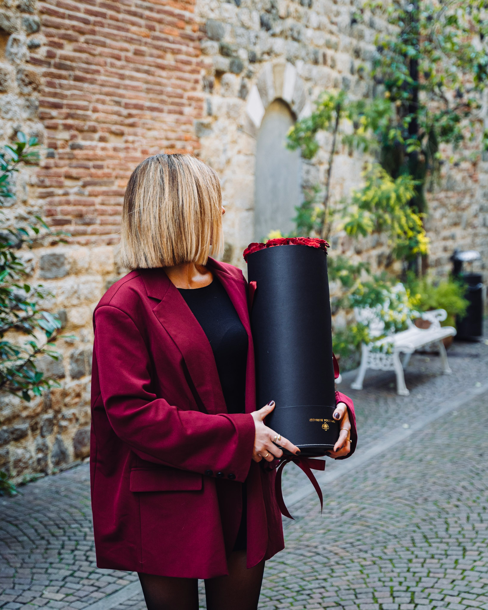 Una box chiusa, raffinata e minimal, che custodisce al suo interno un prezioso mazzo di 11 rose rosse, selezionate per la loro intensità cromatica e la loro bellezza senza tempo.